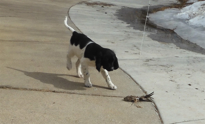 The day before Karter (right) and Kosmo (middle) were driven to Montreal by Joe and Derek, they pointed a sharptail grouse wing-on-a stick, with their sister Kua (left).
