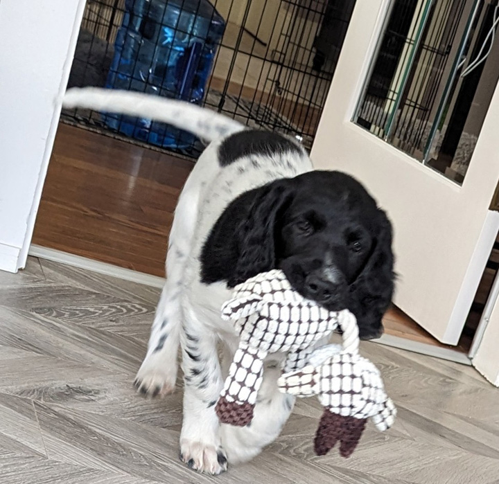Ball-Line, 2F, has gone to Spruce Grove, Alberta, to a home that had a Sunynook LM previously. Her new name is Kona. Here she's pointing a grouse wing-on-a-stick, seeing it here for the first time. (photo 5 April 2024). A video about using this to help pups get started is here: https://www.youtube.com/watch?v=qOeTa0JS29E |