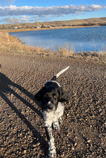 Heron was born 30 December 2019, here at Sunnynook Kennel. Her mother Krokus von Kleinenkneten traces back to Germany. Her father, Sunnynook’s Cue, is derived from a mix of imports and our own Sunnynook dogs tracing back to our original pair imported in the 1970s. Heron has a fine-boned physique and light body at 59 cm at withers (standard = 58-63) and 23.6 kg (53 lbs). She is a ticked dog with one large black mantle and a few black ticks on white background. Her head is all black. She was scored Very Good for Body and Good for Coat in the LMAC Conformation Evaluation in September 2023. Heron is a soft-tempered dog, so much so that she would not have done well in a heavy-handed training regime. She does not easily forgive and forget. By the same token, she is also very cooperative and trainable. For example, Heron was apparently challenged by beavers on a long-distance open water retrieve 2 years ago and because of this she avoids big open water to this day. Unless a duck is in open water, in plain sight, Heron chooses to search near-shore water and marsh, but this she does with a good nose and will to find. In the field, Heron is a joy to watch with a purposeful search, typically casting well out across the wind. In both water and upland she knows to use her good nose well. Heron is a natural retriever, meaning she knows no ear pinch. Heron will sit to deliver with a mere raising of a finger and sit patiently to have her picture taken. She has reached this stage by simply “encouraging” retrieving of frozen pigeons, not dummies, from puppyhood on. Her retrieving patience typically only reaches a limit working on hot days when we tend not to expect show but simply take her bird brought to hand. |