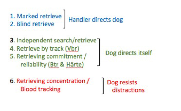 The chart above shows six different elements to retrieving or recovery of game by hunting dogs. Each element involves a more or less different task and, similarly, more or less different motivation that a dog brings to it. These differences do not have sharp boundaries, but rather blend into one another. We should be explicit as to which task we mean when we talk about retrieving.