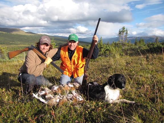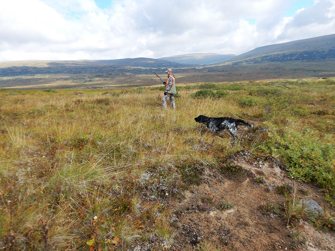 Willow-, white-tailed- and rock ptarmigan exist in this 6500 km2 Spatsizi Wilderness, that has no roads but many creeks, lakes, and mountains. The region is drained by the Stikine River which flows through the Alaska Panhandle to reach the West Coast. White-tailed, and especially willow ptarmigan, can be found in the spruce forest openings below the 1600-2000 m plateaus, but rock ptarmigan prefer the higher elevations. Spatsizi clients are drawn to a variety of vacation packages ranging from big game hunting to nature interpretation and photography out of a 5-star lodge setting. Bobbi and I were to hunt the summer-brown willow ptarmigan that flash white wings when they flush, their call resembling a person laughing.