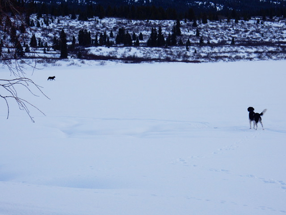 Photo: Here Abby is telling three wolves to stay clear of the Lodge and surroundings. Luckily for Abby, the wolves decided to comply. |