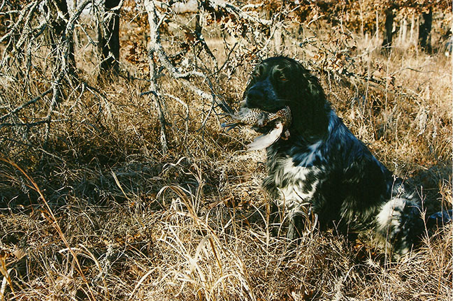 This newscast reminded me of a feat by Sunnynook's Macaw "Mac". Here no human, but a Bobwhite Quail's life was on the line. While hunting some years ago in the Flint Hills of Kansas by invitation of Janice and Ron Franks (Cedar Ridge Kennel). I'd lost sight of Mac. I waited and called, but having already fallen well behind the rest of the hunters I decided to move on and let Mac find me. When I finally saw him coming he was behaving oddly. He made persistent eye contact and slowed his approach staying well behind me. His manner told me that he was trying to tell me something. Risking falling yet further behind, I turned and followed him. With a renewed spring in his step he lead, but stayed within sight, not searching but going from A to B. After about 300 m, he went on point at undergrowth where oak had been cleared. As I walked past him, the covey rose and I managed to drop a Bobwhite Quail. Everything about Mac's manners was purposeful - he must have left point at last, came to find me, got me to follow him and went on point again. I was in awe at what had just happened. I also was deeply grateful and proud of my long-time hunting companion. At the same time, I found it a humbling experience. After all, we humans think we're in charge - are we not? |