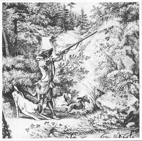 This drawing was likely pre-planned by the artist to show several characteristics at once, of the time represented. The gun resembles an early shotgun that could be swung and used on moving small game in the 1700s. One of the dogs is shorthaired, suggesting a hound. It is on a lead, content to stay by the hunter. The other two are a large and a small bouncy type, longhaired and keen to go with the flush. The dogs resemble the two broad sources that were to help form the German versatile dogs of today. This time signals a gradual shift in dog use. Prior to gun hunting, the spaniels were used prominently in falconry where the dogs needed to flush for the falcon to begin the chase. Some spaniels of the 'setting' type were used with nets to capture birds the dogs first located. The hound, prior to gun use, was used to track and then 'point out' big game in resting cover in preparation for the next day's driven hunt. These hounds were called "Leithunde" (leading dogs) or lymers in English.