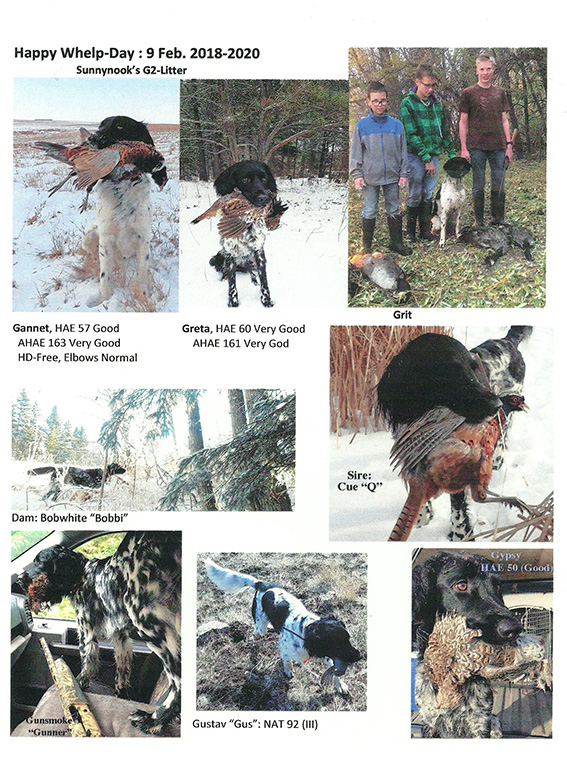 From the Sunnynook G2 litter of eight puppies, six owners stayed in touch with us and reported on the rich hunting they enjoy with their dogs. Spread from Manitoba to British Columbia to Idaho, the dogs have hunted Canada geese, Ruffed Grouse, Blue Grouse, Gray partridge and Pheasants. Some of them have already been field, health and conformation tested, providing a good chance that those that satisfy our performance requirements will go on to breed to help maintain the working dog tradition. The parents, Sunnynook’s Bowhite "Bobbie" and Cue "Q", have earned a Progeny Performance Award for this litter by having at least four puppies pass a Hunting Aptitude Evaluation or Natural Ability Test. We congratulate the young dogs, their parents and their owners! by Joe Schmutz, 23 February 2020 |